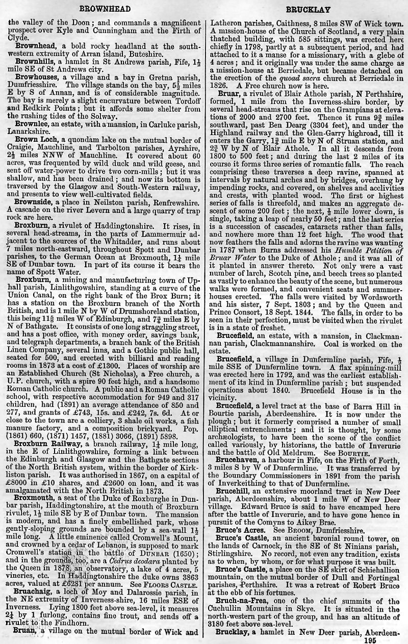 Brownhead, Brownhills, Browhouses, Brownlee, Brown Loch, Brownside, Broxburn, Broxburn Railway, Broxmouth, Bruachaig, Bruan, Bruar, Brucefield, Brucehaven, Brucehill, Bruce's Acres, Bruce's Castle, Bruch-na-Frea, Brucklay