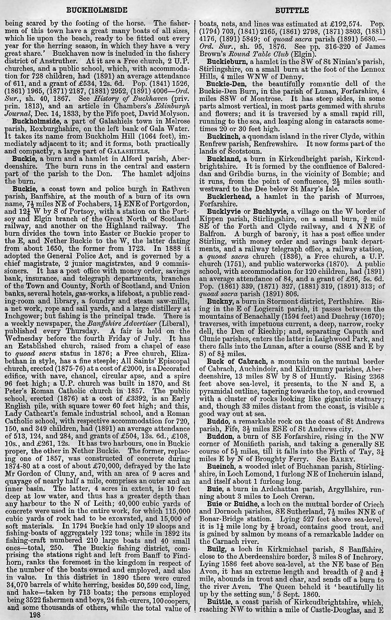 Buckholmside, Buckie, Buckieburn, Buckie-Den, Buckinch, Buckland, Bucklerhead, Bucklyvie or Buchlyvie, Buckny, Buck of Cabrach, Buddo, Buddon, Bueinch, Buie, Buie or Buidhe, Builg, Buittle