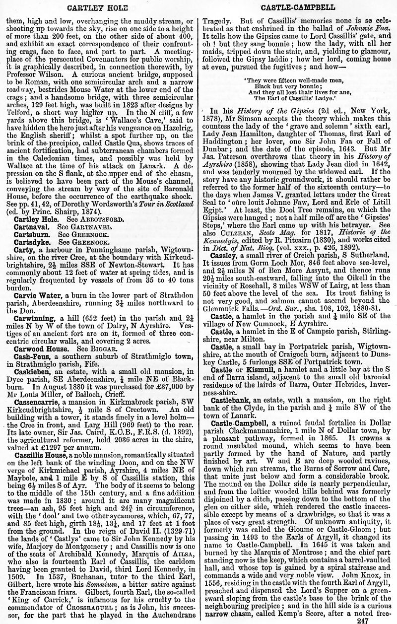Cartley Hole, Cartnaval, Cartsburn, Cartsdyke, Carty, Carvie Water, Carwinning, Carwood House, Cash-Feus, Caskieben, Cassencarrie, Cassillis House, Cassley, Castle, Castle or Kismull, Castlebank, Castle-Campbell