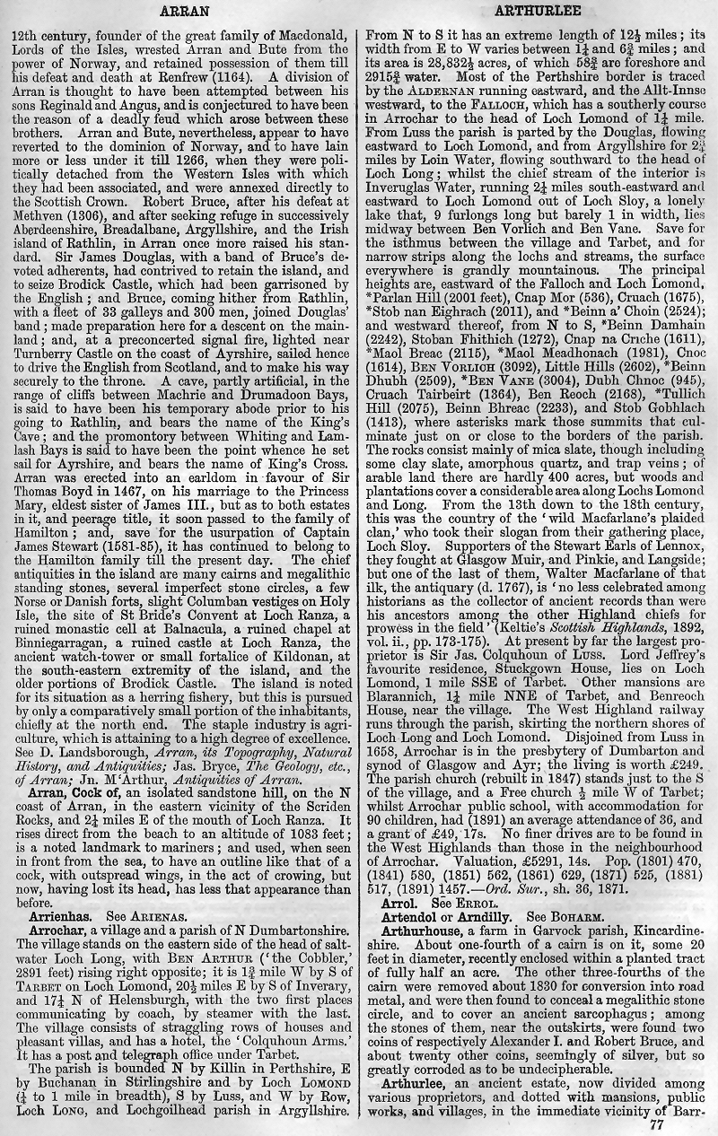 Arran, Cock of, Arrienhas, Arrochar, Arrol, Artendol or Arndilly, Arthurhouse, Arthurlee