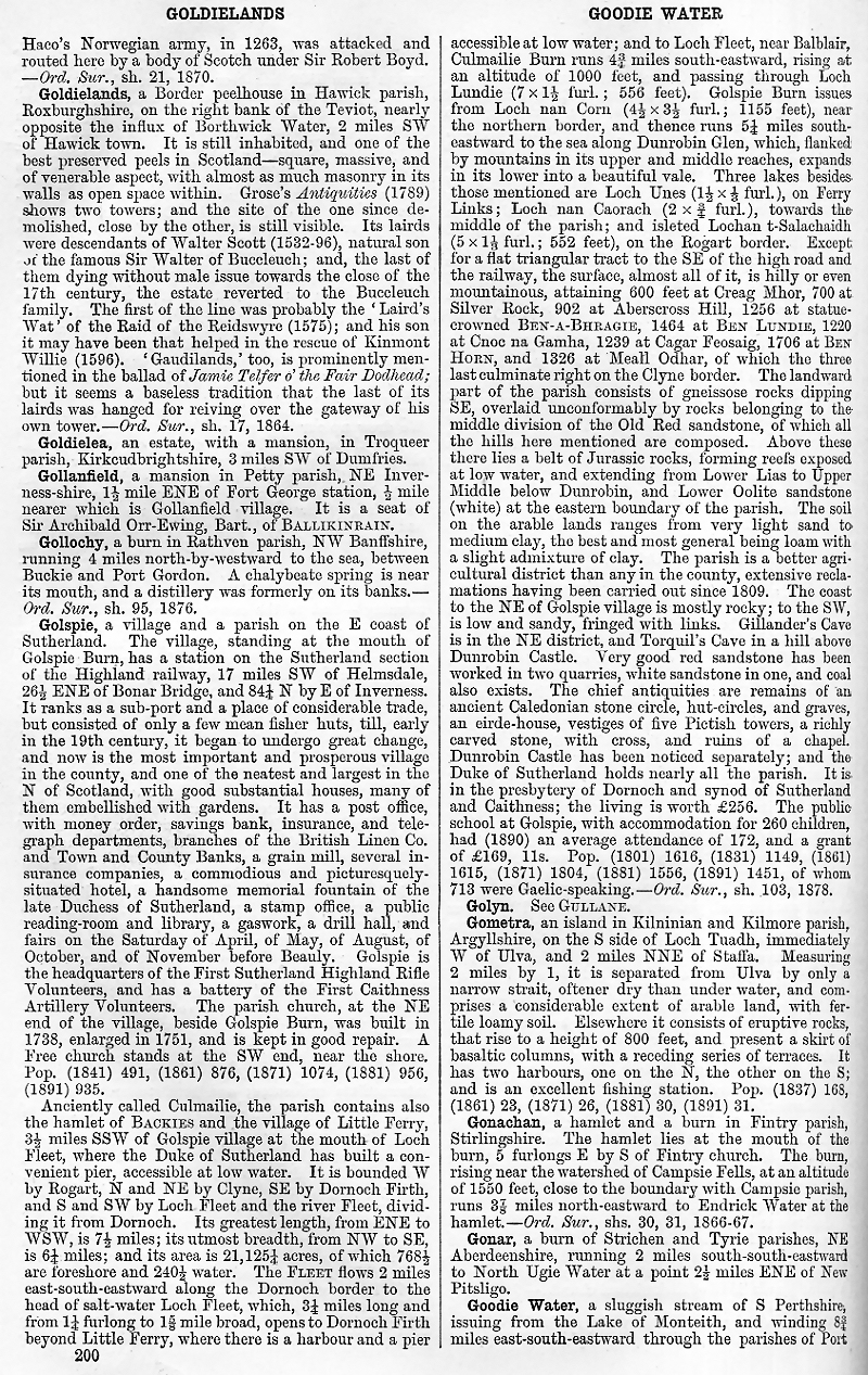 Goldielands, Goldielea, Gollanfield, Gollochy, Golspie, Golyn, Gometra, Gonachan, Gonar, Goodie Water