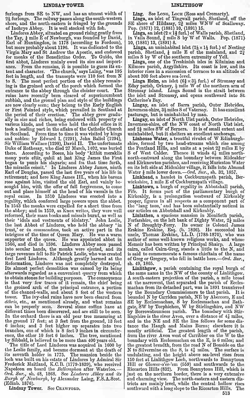 Lindsay Tower, Ling, Linga, Linga Holm, Lingay, Linhouse Water, Linkhead, Linktown, Linlathen, Linlithgow