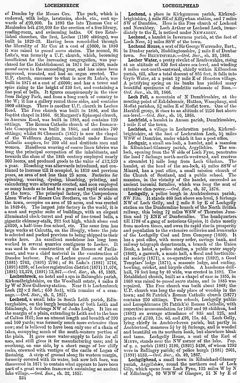 Lochenbreck, Lochend, Lochend House, Locher Water, Loch Fell, Lochfield, Lochfoot, Lochgair, Lochgelly, Lochgilphead