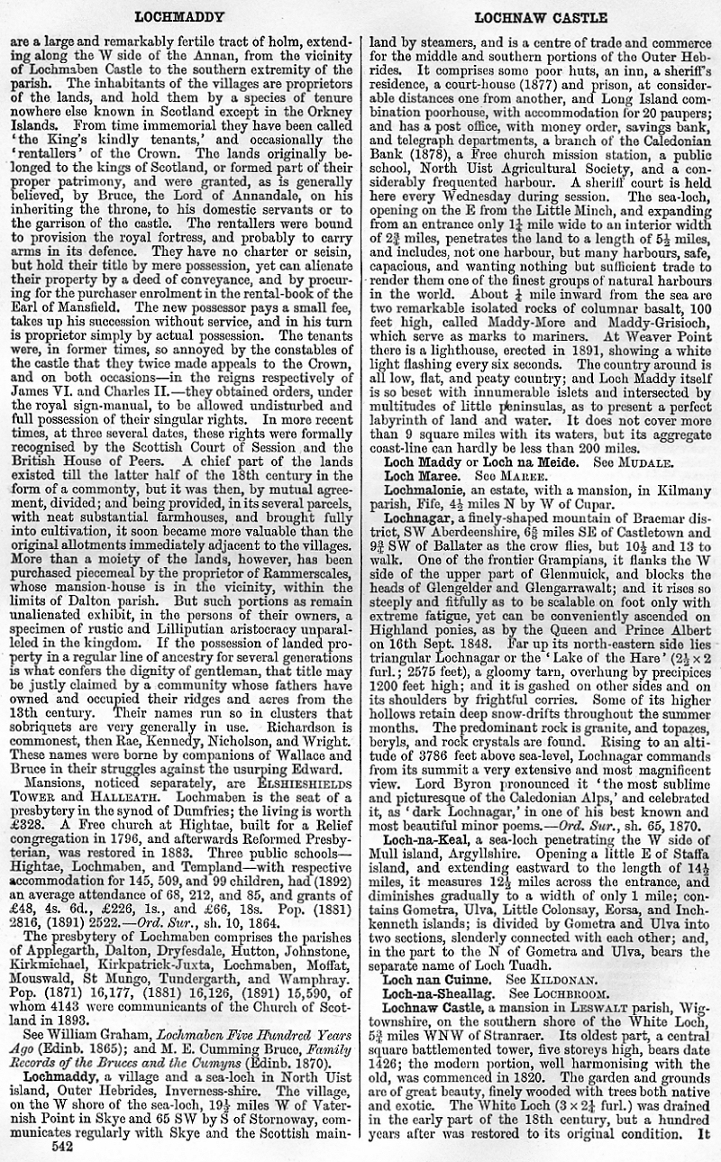 Lochmaben, Lochmaddy, Loch Maddy or Loch na Meide, Loch Maree, Lochmalonie, Lochnagar, Loch-na-Keal, Loch nan Cuinne, Loch-na-Sheallag, Lochnaw Castle