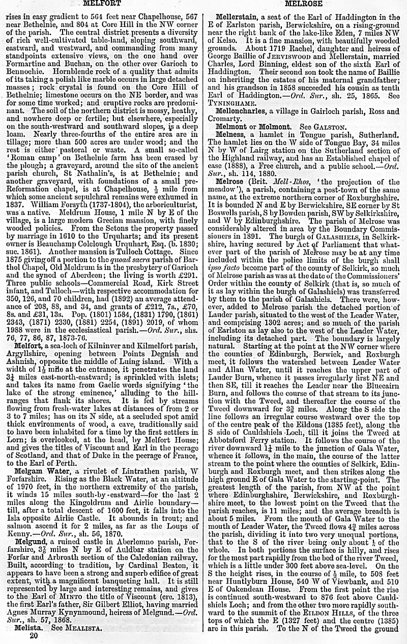 Melfort, Melgam Water, Melgund, Melista, Mellerstain, Melloncharles, Melmont or Molmont, Melness, Melrose