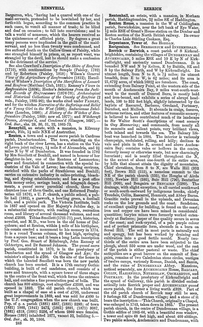 Renfrewshire, Rennyhill, Renton, Rentonhall, Renton House, Tower of Repentance, Rerigonium, Rerrick or Rerwick