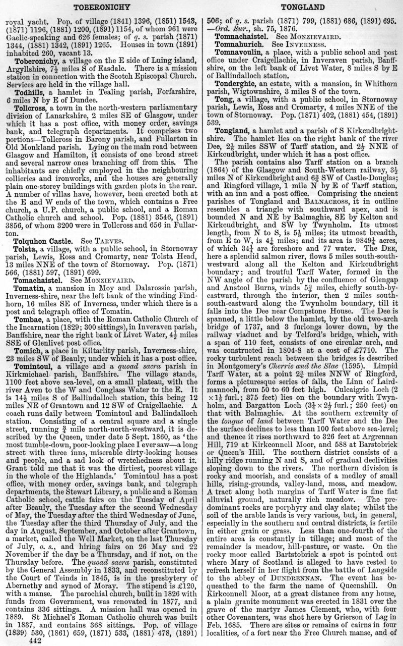 Toberonichy, Todhills, Tollcross, Tonguhon Castle, Tolsta, Tomachaistel, Tomatin, Tombae, Tomich, Tomintoul, Tomnachaistel, Tomnahurich, Tomnavoulin, Tonderghie, Tong, Tongland