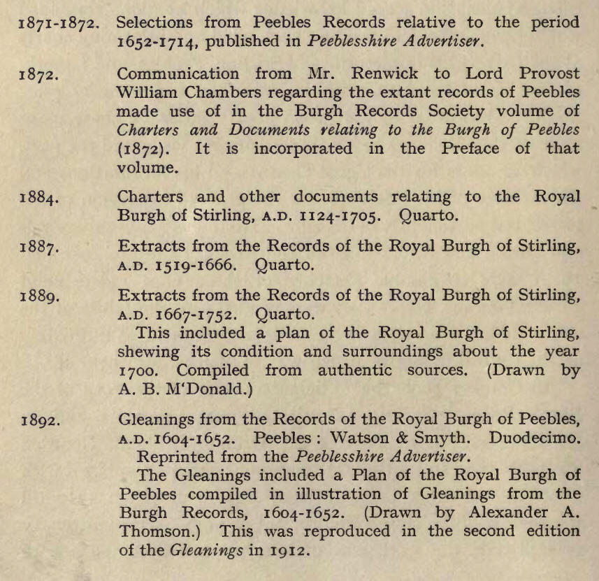 Renwick's independent reputation from an early period may be inferred from his selection by the antiquaries of Stirling and Lanark to edit the records of these burghs—Stirling, which he accomplished in three volumes in 1884-89; and Lanark in one volume in 1893, all duly equipped with luminous prefaces, setting forth the historical position of each of these ancient and important corporate communities.