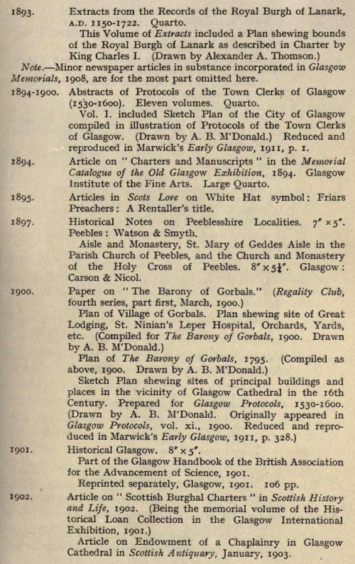 What the old notaries before him had done to register the life of the community and the topography of the place, Renwick in broader and better fashion achieved not less faithfully by his many books, not jealously shutting up his material in secret protocols, but making them for the first time a connected whole for general information. After all, what is the historian but a notary in excelsis? Surpassing any predecessor of either craft by the extent and variety of his output, his acuteness as a topographer, his sleepless memory of facts and his fidelity to the mass of record he interpreted, he holds a place all his own in the goodly fellowship of those who have built up the story of the city of Glasgow. The work he leaves behind him, not the gleaning but the harvest of half a century, is in great measure the primary authority of the civic history, and his memory will endure. It is the last office and much valued privilege of old friendship, an intimate and genial association of nearly thirty years, to add this stone to the cairn of Glasgow's greatest chronicler.