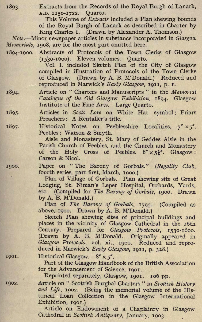 In conjunction with friends, and especially with A. B. M'Donald, City Engineer, he drew up from time to time various maps illustrative of particular phases of burghal growth in earlier times. These maps or plans were reconstructions of no common skill : nothing short of the exhaustive topographical and record knowledge which he alone combined would have sufficed to produce such lucid and informing charts of the past as his re-picturings of Stirling, Peebles, and Lanark, as well as of Glasgow, with its suburban communities prior to their absorption in the urban area. Probably these maps indicate that Renwick in his studies, always visualised the past, which accounts for the signal clearness of his localisations and the security of his inferences on the gradual expansion of the towns, but particularly of Glasgow. His monographs on Gorbals and Calton and Anderston (for the Regality Club in 1900 and 1912) were invaluable sketches of these once independent baronial burghs, before they were welded into the fabric of the city. He knew the detached constituent elements as intimately as the central organism which was to incorporate them all.