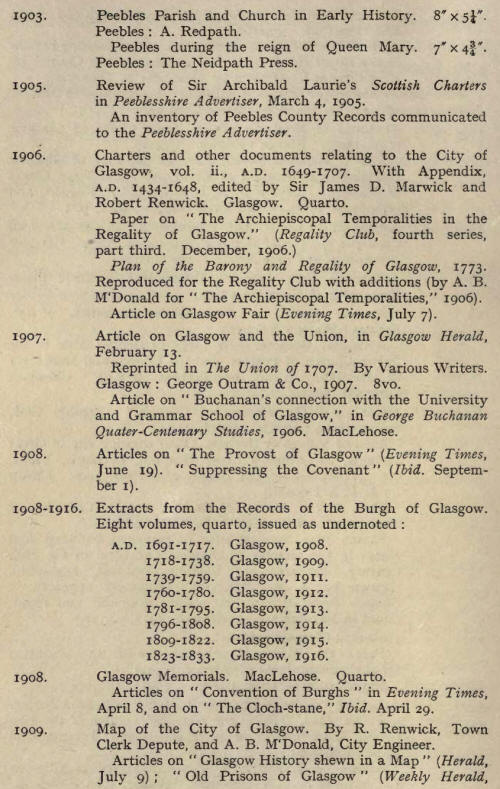 How quickly after coming to Glasgow Renwick found his way into the heart of the burgh records there is evident from the appearance in 1876 of a volume of Extracts from the Records of the Burgh of Glasgow, A.D. 1573-1642. In the preface the editor, Mr. Marwick, with a frank emphasis which did him honour, expressed very exactly the nature and measure of the service rendered by his assistant. "In this work," he said, "as in the corresponding selections from the records of Edinburgh and Peebles, the editor owes everything to the care, intelligence, and accuracy of Mr. Renwick, by whom the transcripts have been made, the proof sheets collated, and the index prepared." The same service he was to continue to render in selecting and presenting the text in at least six other solid tomes of Glasgow record, edited by Air. Marwick, who was knighted in 1888. The latest of these tomes, in which Sir James's name stood alone in the editorship, was in 1905, and in the preface he took occasion to observe regarding Renwick that his intimate knowledge of Old Glasgow was unique. In 1906 Renwick's name for the first time stood along with Sir James's on the title page of the second volume of Charters and other Documents relating to the City of Glasgow, Vol. II., A.D. 1649-1707, with Appendix, A.D. 1434-1648. It was a becoming close to a series which began in 1876 that the long colleagueship should be thus formally commemorated. Sir James had now retired from the town clerkship, and had practically committed to Renwick's hands Pro futuro the editorial control of his burghal trust.