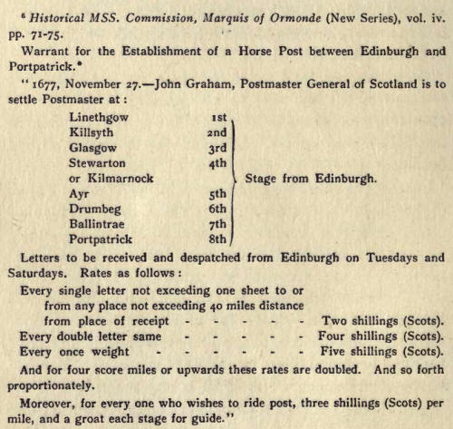 On December 1st Lauderdale again wrote to Viscount Granard to tell him that he was sending to him James Maitland, "one of the lieutenants of the regiment of Guards here"—his own cousin. Maitland was entrusted with a document signed by the Duke of Lauderdale headed " Instructions concerning Disorders in the Western Shires of Scotland," which shows clearly the exact position of military affairs in Scotland. At. the same time the Act of Council for establishing the post between Ireland and Scotland, so much desired by Lauderdale in view of the present crisis, was sent to Ormond, although he was informed that it would be the middle of January, 1678, before the post could be used and that meanwhile they must continue to communicate by means of expresses. The fact of the establishment of the post is also mentioned in the "Instructions," since Lauderdale evidently considered that a quick means of communication between those in command in Ireland and himself was absolutely essential. [6]