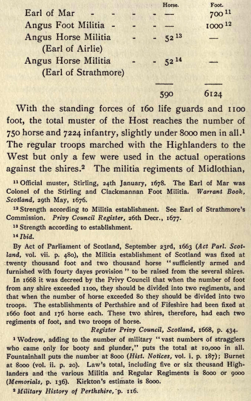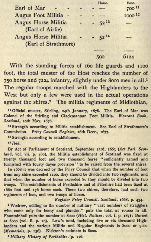 Along with Atholl and Perth, the Privy Council had commissioned the Earl of Murray to raise the men of the Stewartry of Monteith and the Lordship of Doune, the Earl of Mar to levy his Highlanders from the Braes of Mar, and the Earl of Caithness to lead to the rendezvous the Highlanders on his estates in Perthshire and Argyleshire. [Register Privy Council, Scotland, vol. v. (Third Series) p. 301.] It had been decided also that certain regiments of lowland militia should likewise be sent to the West and, therefore, the Earl of Strathmore was commissioned to raise the militia troop of horse and the regiment of foot under his command in Forfarshire, while the militia of the shire of Edinburgh, under the command of Lauderdale himself, was to be embodied for the purpose of acting as a garrison when the regular troops stationed in Edinburgh should march to the West. The militia troop of horse of the same shire of Edinburgh was to be embodied under the Earl of Dalhousie, and was to lie near Edinburgh ready to carry out any orders of the Council. [Register Privy Council, Scotland, vol. v. (Third Series) pp. 303, 304. S.P. Dom. Car. II., vol. 398, No. 124.]