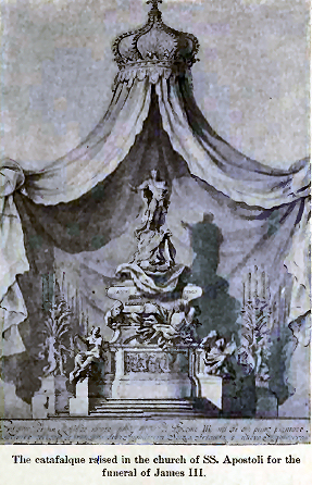 From the same invaluable source, the "Diario di Roma" (n. 2729), we gather many particulars about the death of Queen Clementina, which took place on January 18, 1735, and about her interment in St. Peter's. The theatres were closed, much to the annoyance of the managers and the public, as it was carnival time; also the illuminations and fireworks prepared in honor of the newly elected Cardinal Spinelli, Archbishop of Naples, were given up. The funeral ceremonies began in the parish church of SS. Apostoli, where the body of the Queen was exposed on a catafalque, of which we have an etching by Baldassarre Gabuggiani.