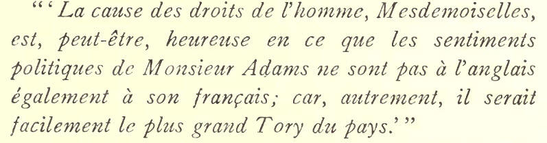 A very free translation being, "It is very fortunate, ladies, for the cause of the rights of man, that the political sentiments of Mr. Adams are not so English as his French is; because, if they were, he would easily be the greatest Tory in the country."