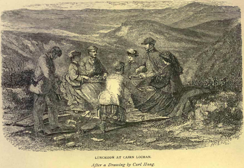 We sat on a very precipitous place, which made one dread any one’s moving backwards; and here, at a little before two o’clock, we lunched. The lights were charmingly soft, and, as I said before, like the bloom on a plum. The luncheon was very acceptable, for the air was extremely keen, and we found ice thicker than a shilling on the top of Cairn Turc, which did not melt when Brown took it and kept it in his hand.