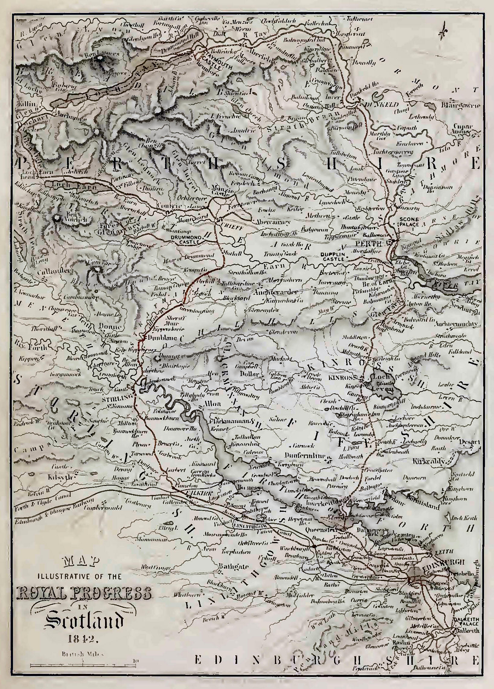Such was the view which the Queen for the first time enjoyed of her as yet distant Scottish capital, and such were the general features of its environs, of which it is much more easy to give a catalogue than to afford any just conception. But to complete the inspection of the panorama of the Firth, by wdiich Her Majesty wras then surrounded, it was necessary to look back towards the east, where the great bay of Musselburgh opened its bosom in a wide circle, with its numerous maritime villages, surrounded by a richly cultivated country, rising from the sea with gentle slope; with Gosford, the residence of the Earl of Wemyss, appearing like a white speck on its margin, and, beyond it, the comparatively low point of Gullane. Behind all this arose the distant Lammermoor range, with Dunpender, the Garleton Hills, North Berwick Law, and the huge bulk of the Bass Bock. This place of strength was seized during the revolution by a desperate band of freebooters, who had a large boat, which they hoisted up the rock, and let down at pleasure. With this they committed outrageous robberies on the mainland, and took many vessels at sea. They held it as the last place for James II., but having lost their boat, and their usual supply of provisions from France having been cut off, they were at last starved into surrender. Then looking past the island of Inchkeith, towards the eastern extremity of Fifeshire, the eye as it returned picked up the misty eminences of Kelly Law and Largo Law, and the two Lomonds, with all the small towns which gem that coast. It dived into the bay of Kirkaldy, and coming on still to the westward, alighted on Kinghorn, remarkable as being the place where those Norsemen under the brother of Canutus, King of Norway, landed in the middle of the eleventh century, and were defeated with great slaughter by Macbeth, Thane of Fife, of whose history so much has been made by the immortal Shak-speare. Near it is the spot where Alexander III. was killed by being thrown from his horse among the rocks. Thence by Pettycur and Burntisland, the eye skirted the loftier and more abrupt, and varied and wooded coast towards Aberdour, the ancient seat of the Earls of Morton. Near this there was a nunnery of the order of St. Francis. Resting for a moment on the quiet and monastic island of Inch Colme, rendered sacred by the venerable remains of its monastery, founded about the beginning of the 12th century by a vow of Alexander I., it then swept over the extensive park of Donibristlc, with its large old mansion, the scat of the Earl of Moray. Donibristle was burned by the Earl of Huntly, on the 7th of February 1591-2. Its proprietor, James Stewart, well known as “the bonny Earl of Moray,” from his great personal attractions, was especially noticed by Anne of Denmark, queen of James VI., and having been praised by her in the King’s hearing as a proper and gallant man, his hereditary enemy, Huntly, took advantage of this circumstance, and having invested the house of Donibristle, he set fire to it under pretence that Moray had been leagued with Bothwell and his associates, against whom he was armed with the royal commission. The bonny Earl escaped from the conflagration, and hid himself among the rocks on the shore ; but the silken string of his knapscull tippet had taken fire, and as it slowly burned unknown to him, its light betrayed him to his enemies, who pierced him with a multitude of death wounds. A banner recently existed, with his pale corse extended on it, gaping with horrible gashes, and above it the motto, “God revenge my cause!” This was sent through all the Earl’s lands, both here and in the province of Moray, to raise up the clansmen to revenge; but a Royal proclamation forbid the young Earl to prosecute Huntly for the murder. Beyond Donibristle, the eye was arrested by the narrow strait of Queensferry, but the grand range of the far distant western mountains appeared over it in faint outline, closing in the general panoramic view in that direction. While the Queen was contemplating the various objects thus enumerated, or such of them at least as the hazy nature of the atmosphere allowed her to descry, Her Majesty was greeted by a royal salute from the fort at Leith.