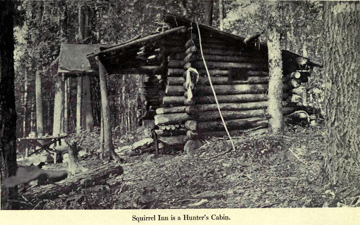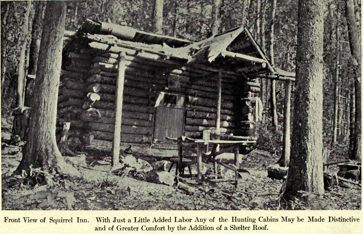 "Squirrel Inn" is a little camp that has given shelter to many sportsmen. Its floor dimensions are eight by ten feet. The peak is nine feet from the floor and the rear wall five feet. This cabin was built with no other tools than an ax and a saw. The great objection which I found with it was the lack of light, due to the use of windows that were too small. The roof was of birch bark, but this quickly became dilapidated and leaky. The floor was made of poles flattened on the upper surface and with the inequalities of the sides smoothed down. Two bunks, one above the other, occupied one end of the camp. To make these, stout poles were set across the cabin