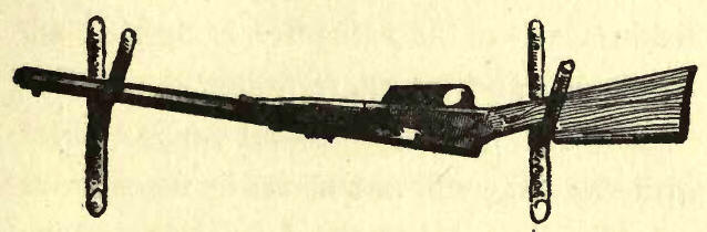 Gun rack, coat hooks, etc., may be made of crotched sticks cut and fastened to the wall as shown.