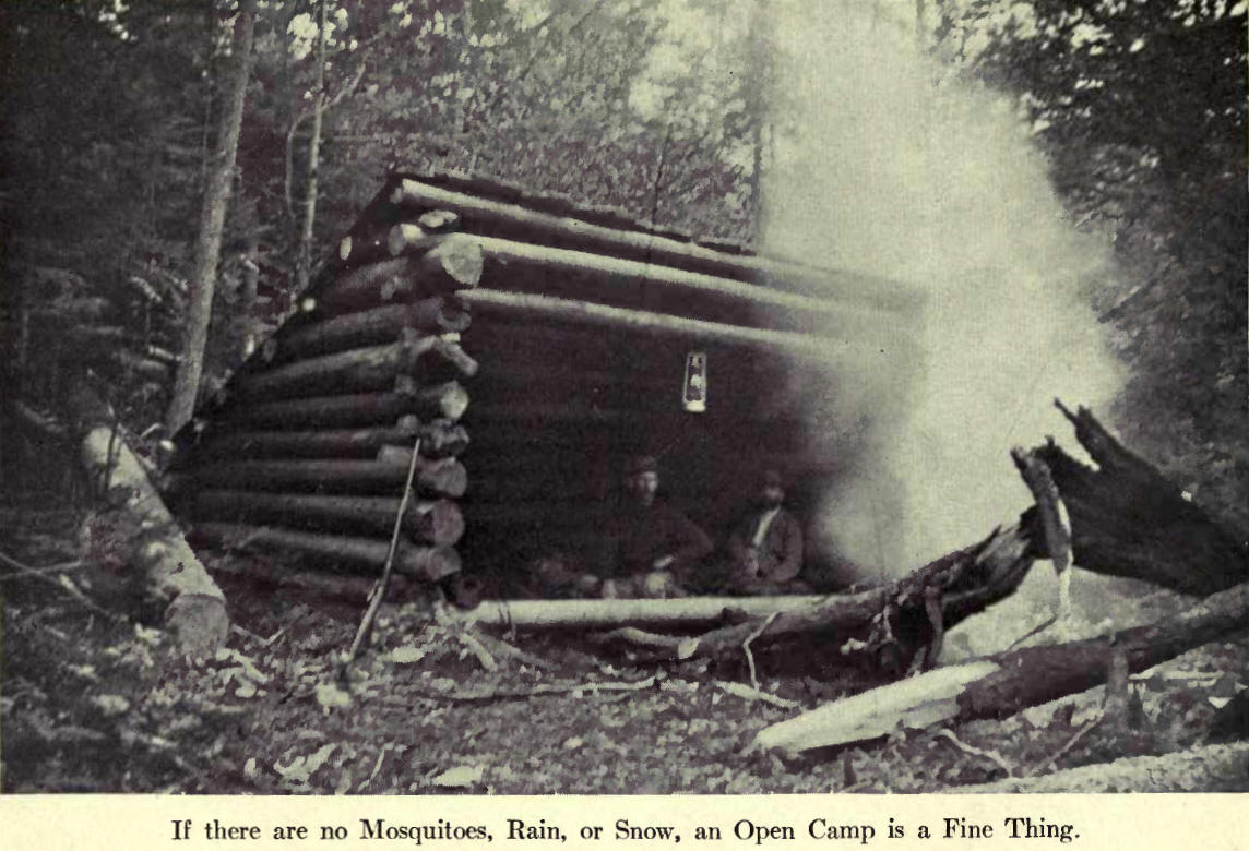 Now, an open camp has many objectionable features. It is cold, and to keep it warm requires an extraordinary amount of firewood. During a storm the wind may haul down an unexpected draw and pile the snow in upon you. In warmer weather they are fairly comfortable, but the mosquitoes just dote upon that kind of camp. True, a good smoke may keep them away, if you have luck and the wind is right. But my experience is that a mosquito enjoying moderate health can stand just as much smoke as I can. Then, of course, there comes the time in the midst of the best sleep ever enjoyed when the smoke apparatus goes out of business, and there is no longer any joy in life.