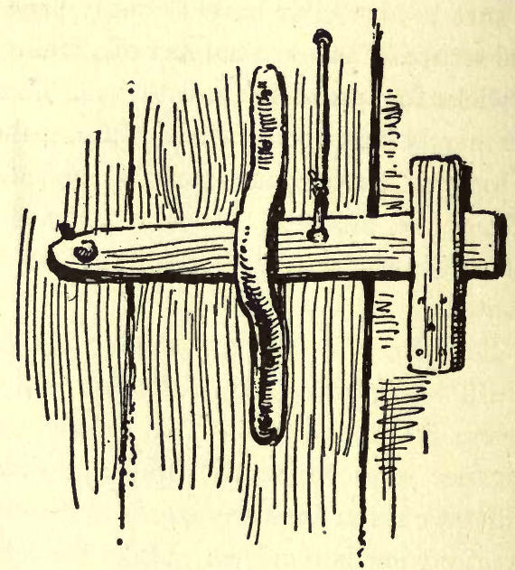 The door will need a fastening and, as it will swing inward, the fastening will of course be on the inside. A simple contrivance is shown in the drawing, which will serve better than any words to describe exactly what is required. Make the latch of hard wood, and if no other means are at hand to bore the hole on which it swings, burn it through with some convenient piece of iron. Attach a cord or thong to the latch, let it pass up above the latch for a foot or so and then through a hole in the door, whence it can hang down ready for use. A small stick tied to the end will prevent the latchstring from inadvertently getting pulled inside the cabin.