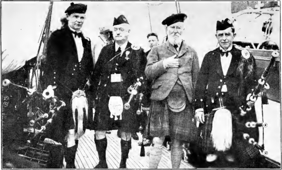 Pipe-Major Robert Reid, Pipe-Major John Macdonald, Sir Reginald MacLeod of MacLeod on board the yacht which took the Dunvegan party to the unveiling and dedication of the Memorial Cairn to the MacCrimmon pipers at Boreraig on 2nd August, 1933.