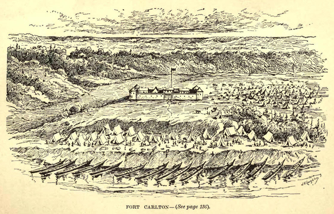 At this time the old fort and the plain around was a busy scene—our crews from the boats, hunters from the plains, parties of Indians in to trade, the air full of stories about the southern Indians and the tribal wars to and fro, scalps taken and horses stolen, the herds of buffalo said to be within a hundred miles from the fort, or less than two days out. Buffalo-skin lodges and canvas tents dotted the plain in every direction. Horse-races and foot-races were common occurrences. I championed older Canada against Indians, half-breeds and Hudson's Bay officials and employees, and in the foot-racing and jumping—high, long, and hop, step and jump —"cleaned out the crowd" and made a name for myself and country, and amid such doings spent fifteen days, when father and his party came up and we moved on.