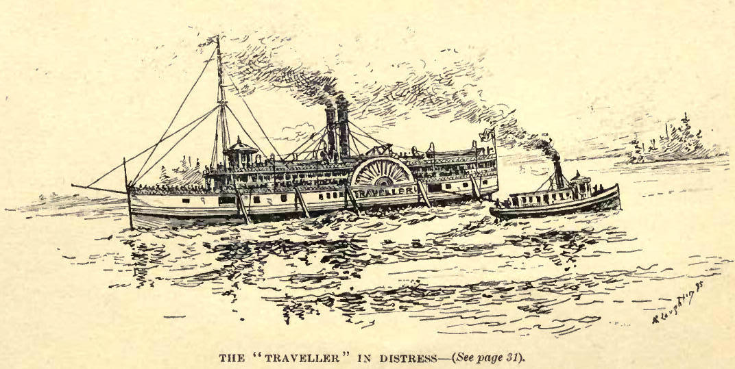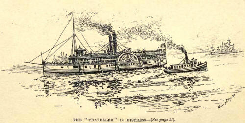 Away we flew down the river, and when near the mouth on the American side, we met a yawl pulling up stream. Who should this be but the Governor of the Hudson's Bay Company, Sir George Simpson. He stood up in his boat and hailed us, and told us that a big steamer named the Traveller, was aground over between the islands. She had started to cross over to the Bruce Mines and come up the other channel. He said you will confer a great favor if you go over and give her all the help you can. She is loaded with passengers, and they are running great risks should a storm come on before she is got off.