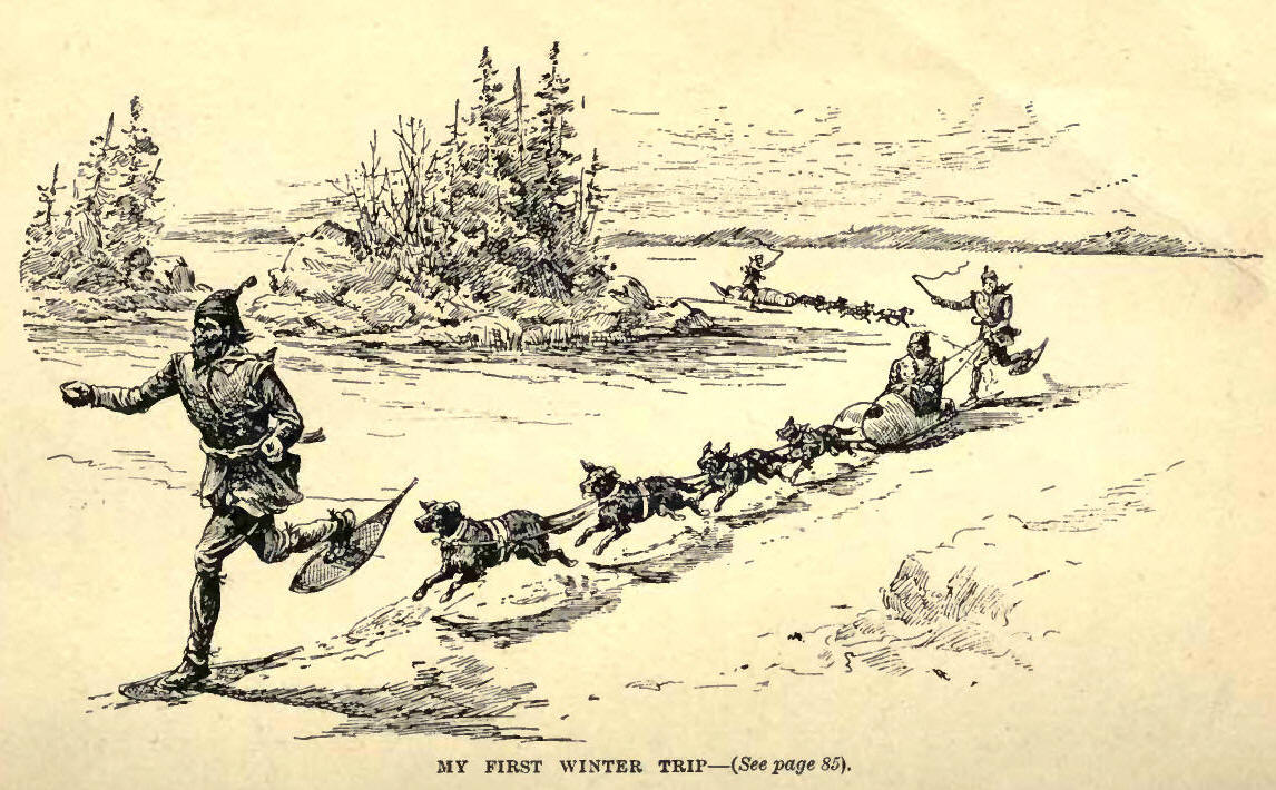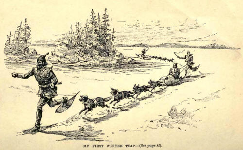 I was now a considerable distance behind my dogs, when, all of a sudden, a feeling took hold of me, and I began to reason in this wise to myself. What is the matter with you? You are strong, you are capable. What are you doing behind here, ready to give up? Come! be a man. And I stepped out briskly, I began to run on those snow-shoes. I came up to those lazy dogs, and gave them such a shout; "they thought a small cyclone had struck them." Soon I was up opposite the island, and I ran away to its shore, and broke a long dry pole, and after my dogs I went, and brought it down alongside of them with another shout, and made them bound off, and picking up the pieces of broken pole, I let them fly at those dogs, and away we went, and presently I was in a glow, and the stiffness in my limbs was gone, and soon I came up to my companions, and said, "Where are you going to have breakfast?" And they said, "Across yonder," pointing to the blue streak in the distance. "Well, then," said I, "why don't you travel faster, and let us get there?" 'William looked at me, and father turned round in his cariole, to see if I was in earnest and from thenceforth, on that trip, as ever since I was all right.