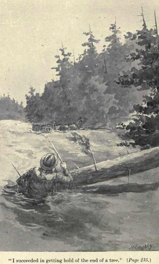 The next day we had a lively time crossing the White Mud. When, after packing everything across on horseback, and holding the provisions up over our shoulders, I afterwards undertook to drive across with the empty cart, we were swept away by the raging current, and I became separated from both horse and cart. My heavy leather clothes impeded my movements, and I came very near swinging around the point for the last time in this world. Finally, when nearly exhausted with fighting the wild stream, I succeeded in getting hold of the end of a tree which extended out into the stream, and made the shore in safety. Our horse and cart fortunately, too, came out on the right side, and after some mending of harness we proceeded on our way.