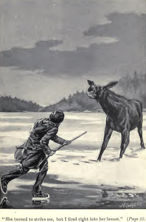 This being our little daughter's birthday, we had decided upon a humble feast, and as there were twelve or fifteen 'lodges of our people with us, all were invited. But as this would not take place until afternoon, I went on as usual and put my fish away- and washed my nets, and then, being at leisure, quietly took my gun and skates and went down to the lake. The snow was beaten hard to the ice in ridges or drifts, and in between these there was good skating. With my skates firmly tied on, I started to reconnoitre the object far out on the ice. When the Indians saw me, some of their best runners came in pursuit. They reasoned, "John has a far-seeing glass; he has already made that spot out, and it is worth a run; let us race him for it." The fact was, I had no glass, but was of that make that I must find out if possible what this object was, and this was the spur of my action that morning and many mornings since then. Soon the whole camp was astir, and soon they saw that the fleetest men were not in it, for even on the snow I ran about as fast as they could, and when in the windings of the ice doubled and quadrupled on them, all the time with my eye keenly on the speck which had aroused my curiosity, and which was now quickly growing larger. Presently, as the big animal rose to its feet, I saw this was a full- grown cow moose. Ah, thought I, this is a royal birthday present for little Ruth. Now began the chase and fun in real earnest, and still my skates gave me a great advantage, for while my game made fast time on the snow-clad spots, it slipped and sometimes almost fell on the places where I was making the greatest speed. Verily it was a most unfair race, as usually are indeed such between man and the lower order of animals, for this was but a sample of all hunting. In a very short time I was upon the big moose, and suddenly she turned to strike me, but I fired right into her breast, straight for the heart, and