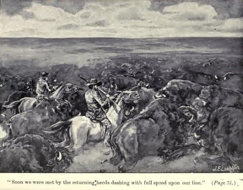 We had some big buffalo runs at this time, one of which was quite exciting. Perhaps there were between three and four hundred of us as we approached the buffalo that morning, when they were feeding on the ascending slope of a broad, gently rounded hill. The incline which we were approaching was dotted thickly with the buffalo. They seemed to be densely packed on the summit, beyond which we could not see. As we rode up the stragglers fell in on to the herd, and soon the top of the flat, oblong hill was black with them. We rode slowly, in a long line, our captain and officers a little in advance, and as we came near the summit the herd broke down the other side and the word was passed to charge. I was on a good horse, and with half a dozen others was soon in advance of the general line. The dust was thick as we rode on the dead race down the declivity. I did not know, nor do I think did many of our party, that at and along the foot of the hill there was a long narrow lake with precipitous banks. At this the advance buffalo balked and turned, and soon we were met by the returning herds dashing at full speed upon our line. The little company of riders I was with was now right in the centre of the meeting rush. Buffalo young and old all around us, and we squeezed and jammed in amongst them and compelled to run with them. I had steel stirrups, and I could hear the ring of them as they struck the horns or were struck in turn by the rushing, seething crowd of wild animals. To make things worse, the main line of hunters came up against the right angle turn of the herd, and presently arrows and balls came, it seemed to us, all around where we were. Not a shot was fired by any one of our small detachment. We looked for room, and room only; for the time we had too much buffalo! Bulls and cows, and yearlings and calves, and noise and wild swirl and gallop—I can never forget the scene, nor yet how mighty glad I was when the fiat along the lake became broader and we spread out more. Now we looked for our game, and began to kill. For about eight or ten minutes, or possibly less, myself and the few with me were having a lively time, and were thankful when we were well out of the scrape with life and limb intact.