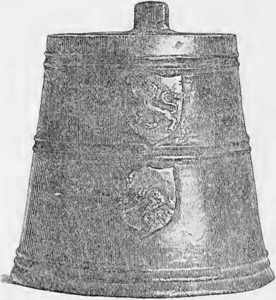 The jug is described as being in the form of the frustum of a cone, the diameter of the bottom being 5rS inches, that of the mouth 4^5 inches, and the depth 6 inches. It is composed of a kind of brass, and from its rude construction has evidently been fabricated at a period when the arts had made little progress in Scotland. It bears upon its side in bold relief the figure of a lion rampant; and another object which has been variously described as a child in a recumbent position, and also the wolf in the arms of Stirling, though it is more likely to be meant for the latter, from the fact that a standard pint in the custody of the City of Edinburgh bears the Stirling arms in the same place. When the jug was filled with distilled water at a temperature of 62° of Fahrenheit, the contents weighed 26,286‘41 grains imperial, the barometer being at 30 inches.