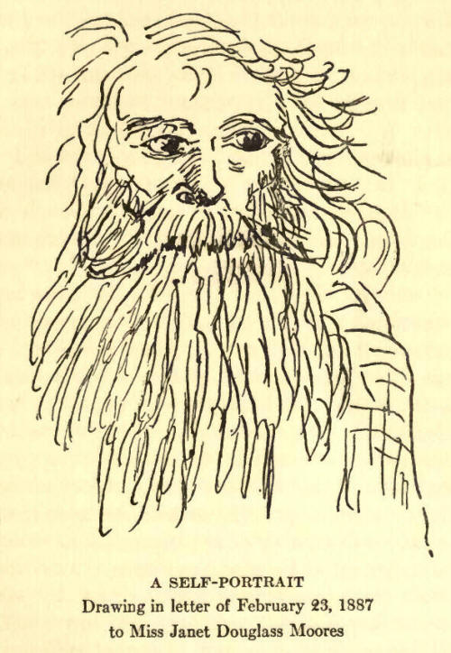 I only meant to tell you that you were not forgotten. You think I may not know you at first sight, nor will you be likely to recognize me. Every experience is recorded on our faces in characters of some sort, I suppose, and if at all telling, my face should be quite picturesque and marked enough to be readily known by anybody looking for me: but when I look in the glass, I see but little more than the marks of rough weather and fasting. Most people would see only a lot of hair, and two eyes, or one and a half, in the middle of it, like a hillside with small open spots, mostly overgrown with shaggy chaparral, as this portrait will show [drawing]. Wanda, peeping past my elbow, asks, "Is that you, Papa?" and then goes on to say that it is just like me, only the hair is not curly enough; also that the little ice and island sketches are just lovely, and that I must draw a lot just like them for her. I think that you will surely like her. She remarked the other day that she was well worth seeing now, having got a new gown or something that pleased her. She is six years old.