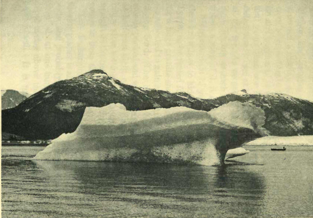 "Ice-mountain hi yu kumtux hide," — glaciers know how to hide extremely well, — said Tyeen, as he rested for a moment after rounding a huge granite shoulder of the wall whence we expected to gain a view of the extreme head of the fiord. The bergs, however, were less closely packed and we made good progress, and at half-past eight o'clock, fourteen and a half hours after setting out, the great glacier came in sight at the head of a branch of the fiord that comes in from the northeast.