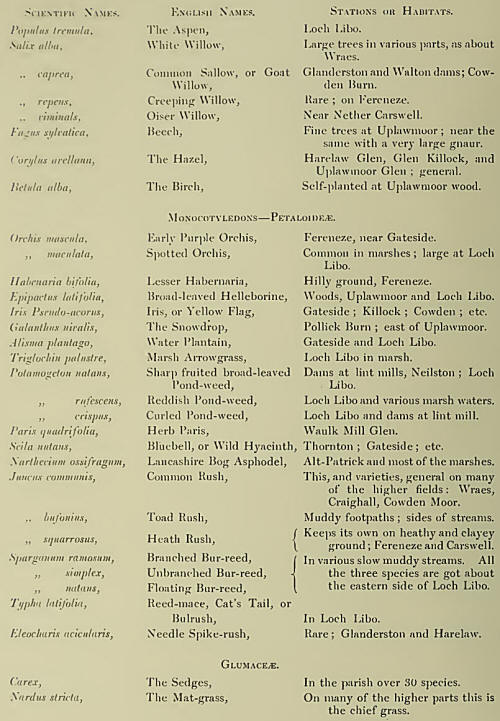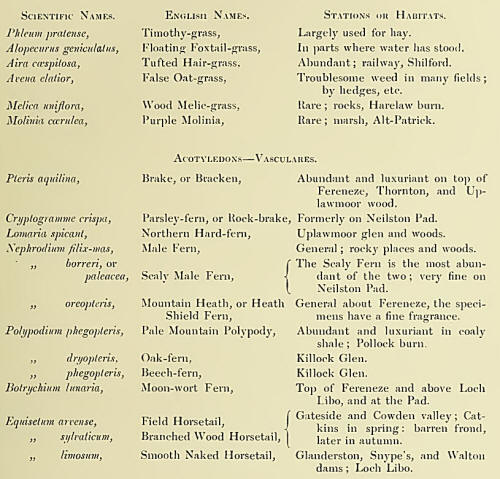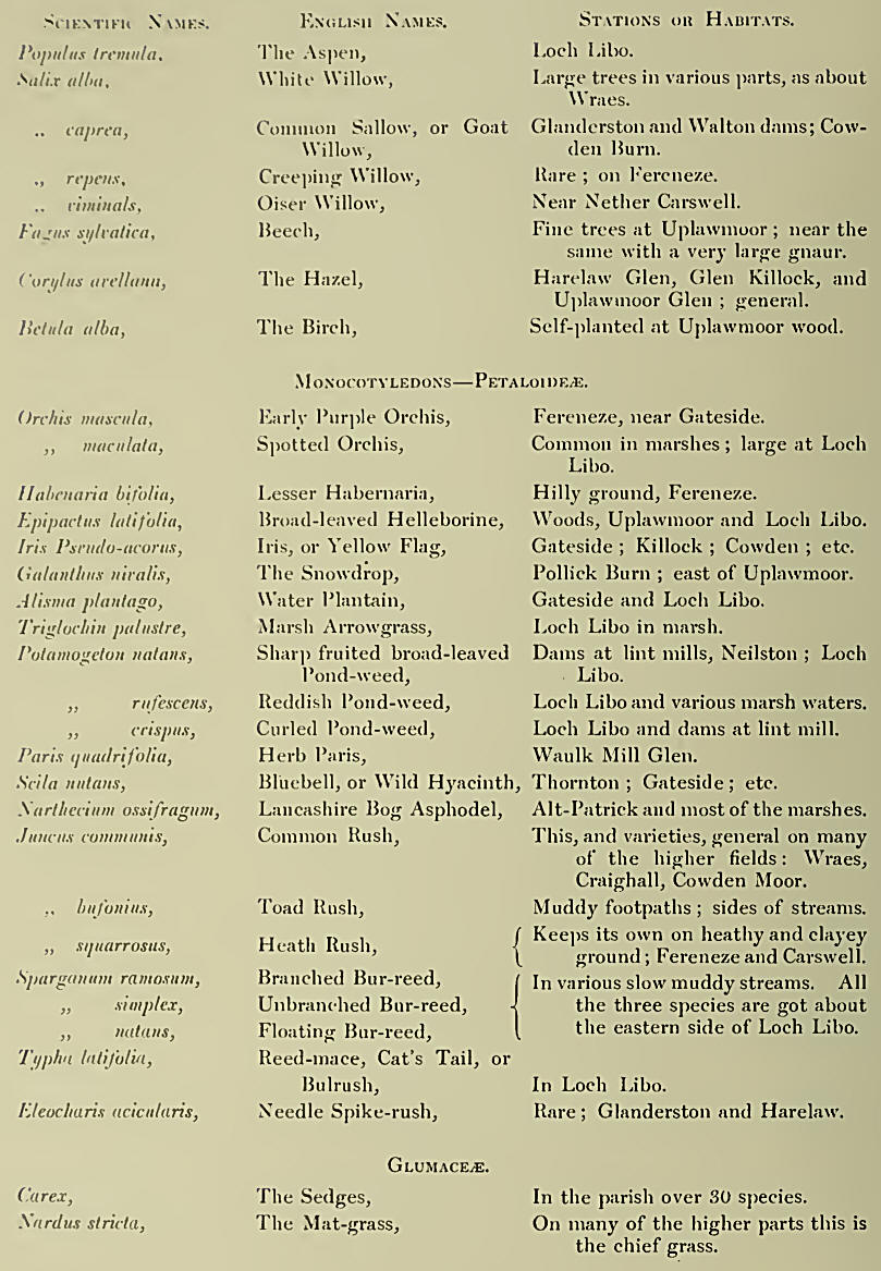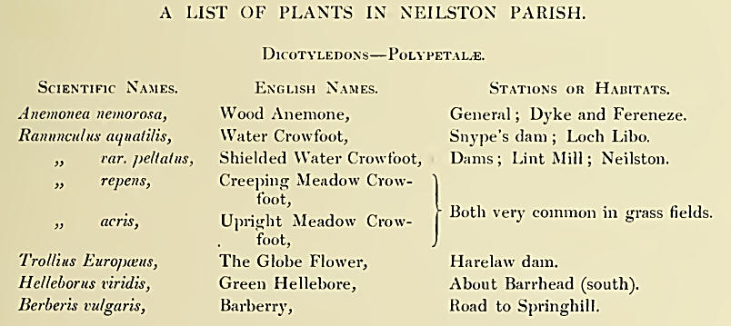 Considering the flowering plants, Neilston parish shows a goodly number of all those that are British. In Great Britain, there are of flowering plants in all 92 natural orders. Of this number, Neilston contains types of 72, which only leaves 20 without types. They may be tabulated thus :—
