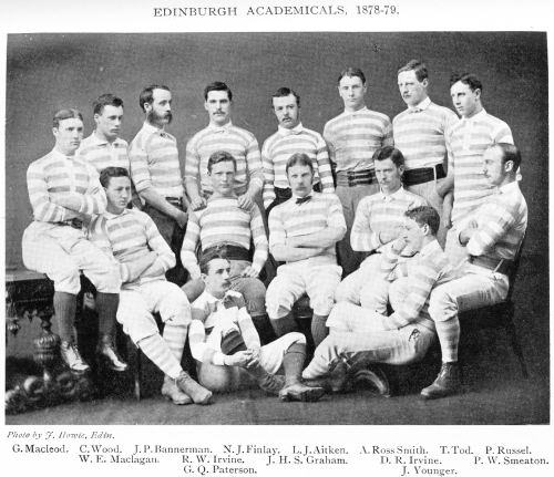 By season 1877-78, T. J. Torrie, the first International product of Fettes, had retired from the Edinburgh Academicals, and Gardine Finlay had gone abroad. The team thus lost two of its best forwards. Frequently reserve, the youngest forward of the Finlay family would almost surely have secured his International place had he continued in the game. Ninian had returned, and he and W. E. Maclagan formed the strongest halfback division the Academicals so far had had. L. J. Aitken, a notable school player and runner, had gone among the forwards, there to rub shoulders with P. W. Smeaton, who could not get his place outside so long as 'Quinty' Paterson and J. Younger were available. E. S. Balfour, the younger brother of 'L. M.,' was playing full-back.
