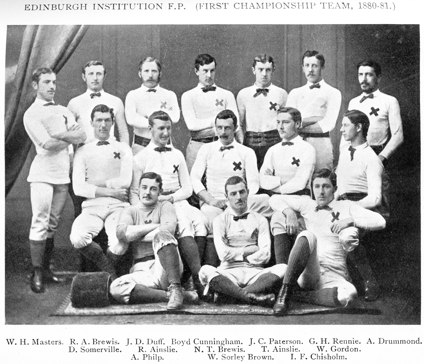 In season 1874-75 the Institution, then under Nat Brewis, were aspiring to recognition among the front rank of the clubs, though the membership was still low. They got a bad beating from the Edinburgh Academicals in October of that season. Ninian Finlay got one of the three tries scored by the Academicals and dropped a couple of goals, which was not by any means an unusual feat for him.
