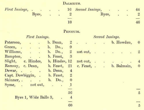 Penicuik total was thus 134, while Dalkeitlh, with four wickets to go down, made 136. (I regret that I cannot give the individual scores of the Dalkeith Eleven.) The Home Club had their revenge, however, at the return match some four weeks afterwards.