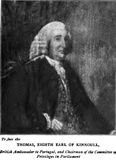 This terminated the direct line of the Hays, and another branch now comes into possession. Francis Hay, Writer to the Signet, acquired the lands of Balhousie, and obtained a charter of the Barony of Dupplin in 1642. He married Margaret, daughter of James Oliphant, of Bachilton. His eldest son died in 1672, and was succeeded by his second son, Thomas Hay. The latter was a man of very considerable abilities, and in 1693 was Member of Parliament for Perthshire. He was afterwards created Viscount Dupplin, and took his seat as such in 1698. In 1709, on the death of the fifth Earl, he was created sixth Earl of Kinnoull. In the Jacobite Rebellion of 1715 he was suspected of being a rebel, and was imprisoned in Edinburgh Castle. He died in 1719, and was succeeded by his son, George, who became the seventh Earl, and married Marjory, third daughter of David, fifth Viscount Stormont, and sister of the first Earl of Mansfield. Earl George was in 1729 appointed ambassador to Constantinople, which appointment he held for eight years. He died in 1758, leaving ten children. His eldest son, Sir Thomas Hay (see illustration), who became the eighth Earl, was born in 1710. He was also an eminent member of the family, having been M.P. for Scarborough in 1736, and for Cambridge in 1741; Chairman of the Committee of Privileges in Parliament; a Lord of the Treasury in 1754; Chancellor of the Duchy of Lancaster, 1758; and British Ambassador to Portugal, 1759. In 1762 Earl Thomas resigned all his appointments under the Crown. It is recorded that the bridge over the Tay at Perth owes to him its existence, being built under his auspices, and at the risk of his private fortune. Though splendid offers were made to him to return to office under the Crown, nothing would induce him to do so. He had resolved to spend the remainder of his life in peace and quietness in the management and enjoyment of his estates. Under his judicious management, his estates, it is said, speedily assumed a new aspect; improvements rapidly advanced, and his tenantry prospered He is said to have been a man of warm but rational piety, and a high-principled, Christian gentleman. He died at Dupplin Castle on December 27, 1787, his death being lamented over the entire kingdom. His only son having unfortunately predeceased him, he was succeeded by his nephew, the Honourable Robert Hay Drummond, eldest son of his brother. Robert assumed the name of Drummond as heir of entail of his great-grandfather, William, Viscount of Strathallan, by whom the estates of Cromlix and Innerpeffray were settled as a provision for the second branch of the Kinnoull family. Colonel John Hay, Governor of Perth at the Rebellion of 1715, was the third son of Francis Hay, and consequently brother of Thomas, the sixth Earl. Robert Hay Drummond, ninth Earl, succeeded his father in 1796. He was a Privy Councillor in 1796, and in the same year was made Lord Lyon, King of Arms. He died in 1804, and was succeeded by his son, Thomas Robert, who became tenth Earl. The latter was born in 1785, and also held the office of Lord Lyon, King of Arms. In 1810 this Earl's brother, the Honourable Francis John Hay Drummond, of Cromlix, was drowned in the river Earn. He had paid a visit to Lord Ruthven at Freeland the preceding day, and was prevented from returning to Dupplin the same evening by the severity of the weather, but set out next morning, so as to accompany his brother to church. Crossing the river on horseback, the current, swelled by a heavy rain, carried him rapidly away, and he perished, nobody being in sight He was then twenty-five years of age. Earl Thomas was succeeded by George, the eleventh Earl, who died in 1897, and was succeeded by his son, the present Earl.