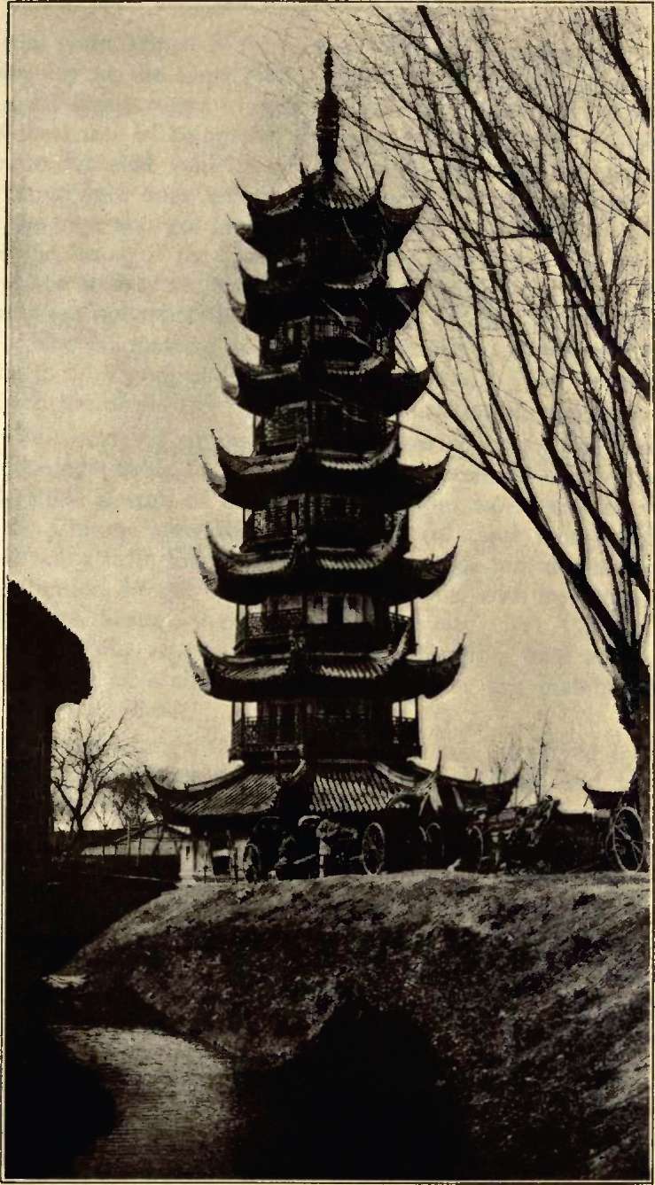 We took lunch at the five-story pagoda which is on a hill at the City Wall. The City Wall is about thirty feet wide at the top, one hundred and fifty feet at the bottom and thirty feet high, in some places much more. The pagoda overlooks the entire city, and is about one hundred and fifty feet square at the bottom and sixty to seventy feet at the top, each story being about fifty feet in height. It is very much neglected, and, like the Empire, is fast going to decay The fortifications on the wall and at this place would have been good one hundred and fifty years ago, but are now of no use. The cannons are on wooden carriages, and many have rotted away until they have fallen down.
