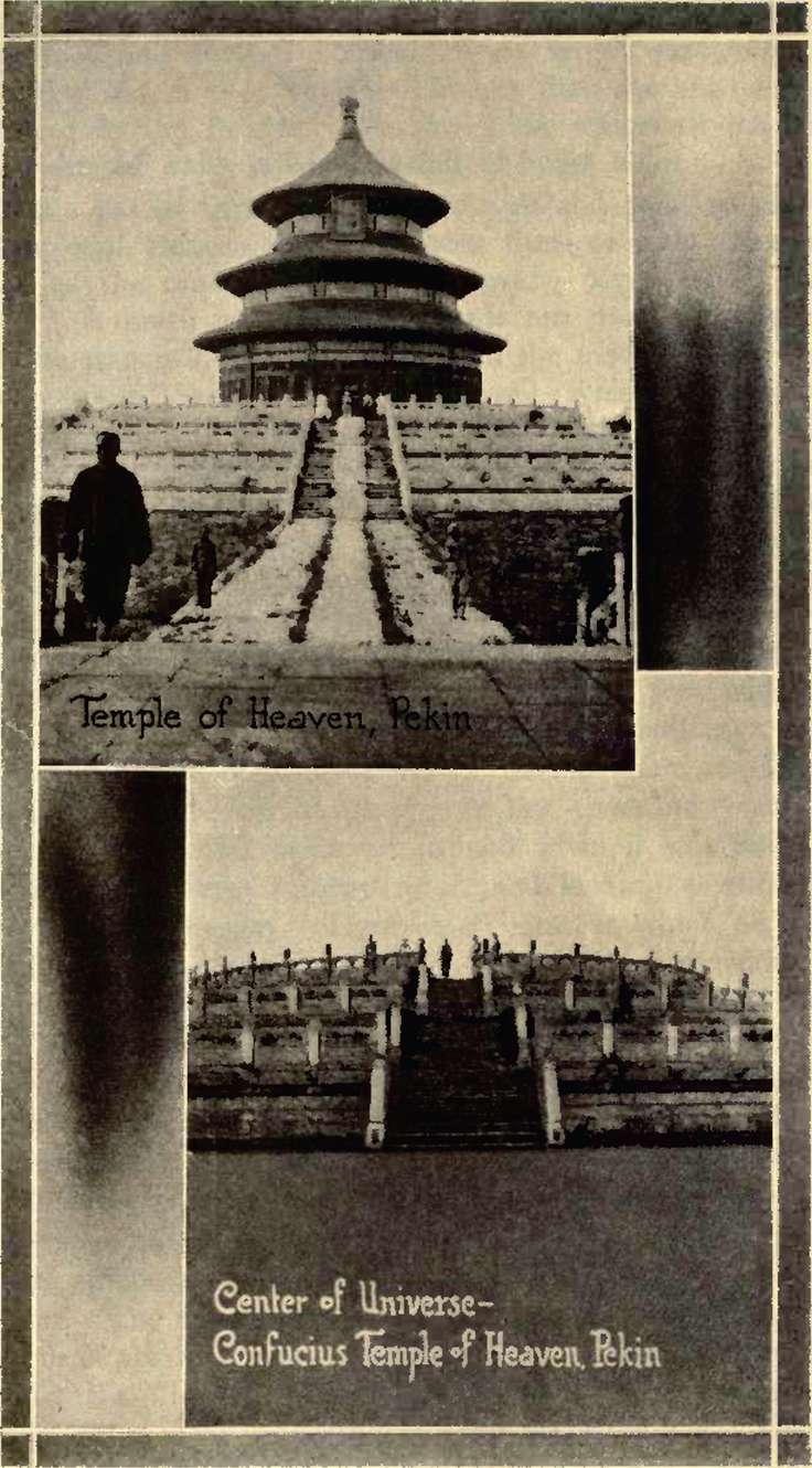 We passed through the outer wall and went to see the Temple of Heaven, which is about three or four miles outside of the outer wall. A very wide, partly paved road, which is much out of repair, leads out past it, being one of the principal thoroughfares from the east. The grounds are enclosed with a high stone wall, which is three and one-half miles in circumference. Here again there are many gates to go through, and a Chinese gate is no ordinary affair, being a very large building highly ornamented with carving, etc. Then we came to a large marble platform about two hundred by four hundred feet, raised about twenty feet from the ground. Once a year the Emperor comes here, and changes his clothes in a tent erected for the purpose, then goes along a roadway two hundred feet wide and one thousand feet long, all marble (all the buildings, pavement, etc., are of white marble) to the altar of Heaven. This is a very line building over one thousand years old, having a beautiful dome all painted when it was built and never having been touched since, and looking as though it were done yesterday. There is an altar at which he kneels and prays for himself and family, then he goes about one thousand feet further to the Temple of Heaven and prays for his people and the nation. Part of this building was burned down a few years ago and rebuilt. Many of the gold ornaments which had been there were stolen by the Russian soldiers. The doors are massive and are fastened with large nails on the outside of which are gold washers, three inches in diameter. The building is just a large circular edifice supported by pillars, the roof being an immense dome. The decorations and paintings are beautiful, and the gardens are arranged beautifully also. There is a building called the Throne Room in which the Emperor receives the principal men of the kingdom after the ceremony. There is also a palace in which he sleeps all night, and then he leaves for another year.