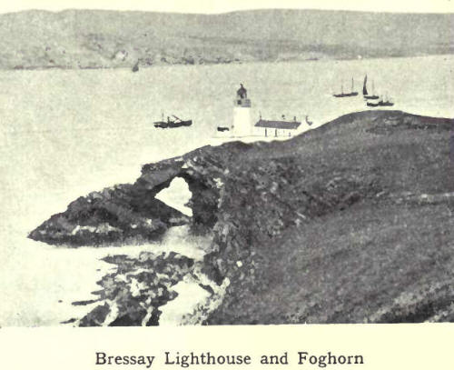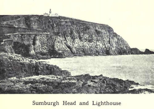 Sumburgh Head, the most southerly point of the Mainland, is also capped with a lighthouse, perched 300 feet above the swirling eddies of the Roost. Erected in 1820, it was the first lighthouse on the Shetland coast. Its group-flashing white light is visible 24 miles in clear weather. North of Sumburgh Head are Grutness Toe and the Pool of Virkie, with their low-lying sandy shores while near by are Sumburgh House and the ruins of Jarlshoff. From this point northward the coast is rocky, with moderately low cliffs, which are broken up by the inlets of Voe and Troswick. The next conspicuous point is the headland of Noness, crowned by a small, quick-flashing white light, a guide to the busy fishing centre of Sandwick, and the fine sandy bay of