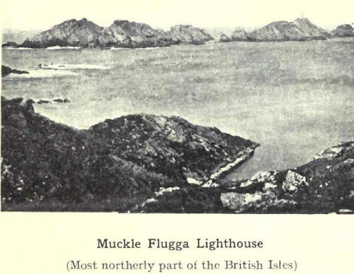 Fair Isle, rock-bound, precipitous and lonely, with but one or two small creeks where vessels may shelter, has two lighthouses, each with a fog-siren and a group-flashing white light--the Scaddon, visible 16 miles, and the Scroo, visible 23 miles. It was on Fair Isle that El Gran Grifon, one of the Armada ships, was wrecked in 188.
