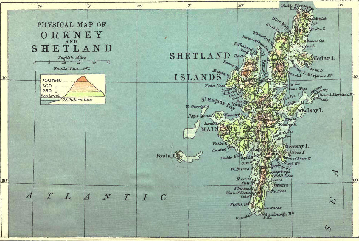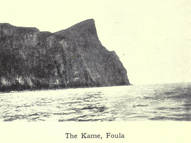 On the east of the extensive bay of St Magnus lies Muckle Roe, with its sea-face of red granite cliffs. To the south are the smaller grazing islands of Vementry and Papa Little, with the channel of Swarbacks Minn between, forming the common entrance to Busta Voe, Olnafirth, Gonfirtli and Aith Voe. Between the last opening and Bixter Voe, on the opposite side, runs an isthmus which connects Aithsting, Sandness, Walls and Sandsting with the other part of the Mainland. The northern side of the peninsula thus formed is pierced by the openings of Clousta Voc, Unifirth and West Burrafirth, while lying off the north-west extremity is the fertile island of Papa Stour, with its high cliffs and beautiful caves, Christie's Hole being the finest. About three miles to seaward are the dangerous rocks of Ve Skerries. The coast from Sandness to Vaila is bold and rocky, the headland of Watsness being the turning-point on this rugged coast. About eighteen miles to the south-west lies the lofty island of Foula. The east side of the island is comparatively low-lying, but the land rises towards the west, where the cliffs tower 1220 feet above the sea. A dangerous shoal, the Haevdi Grund, lies to the east of the island, and it was here that the liner Oceanic was wrecked (1914).