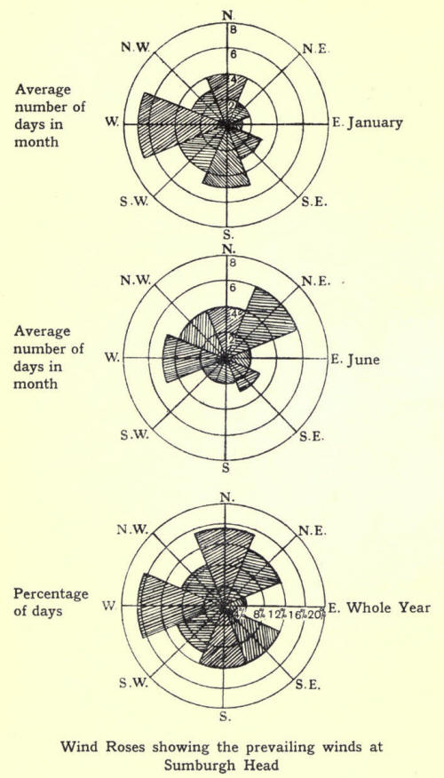 days of each; while August has a total of 5 days from the north and September 6 from the west. The wind-rose shows that for the whole year the west wind prevails with 17 per cent. while the east has only 4. January has 7 days of west wind and only 1 of east; June has 6 days from the north-east, and 4 each from north and north-west. The average number of days in the year with calm weather is 27, with gales 37.