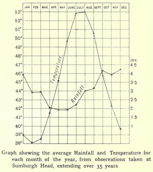As might be expected from its insular position, the climate of Shetland is moist, and the annual rainfall is about 37 inches, while the number of rainy days in the year amounts to 20-1. This is the record for Sumburgh Head, extending over a period of thirty-five years; but of course the rainfall varies considerably in different parts of the islands. The wet period of the year embraces the months of October, November, December and January; while the dry period, if it can be called such, includes May, June and July—May being driest. Heavy falls of snow are not uncommon; but owing to the sea-breezes and changeable weather, snow seldom lies for any length of time.