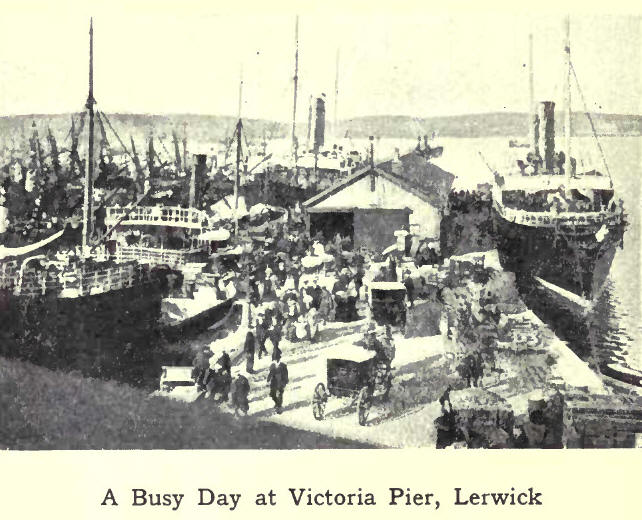 people from Shetland often travelled to Scotland and England by way of the Continent. As time went on, more direct communication was established with Scotland by means of sailing vessels. Trade was carried on by these till the advent of a steamship in 1836, when the paddle-boat Sovereign began to lily between Granton and Lerwick once a fortnight—afterwards once a week—calling at Aberdeen, Wick and Kirkwall. At the present time four steamers regularly arrive from Leith or Aberdeen each week during summer. One of these makes a weekly trip to Scalloway and ports on the west side. Lerwick is the port of call on the east. In addition to these, another of the North of Scotland Company's steamers does the coast-wise trade on the east side and to the North Isles.