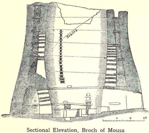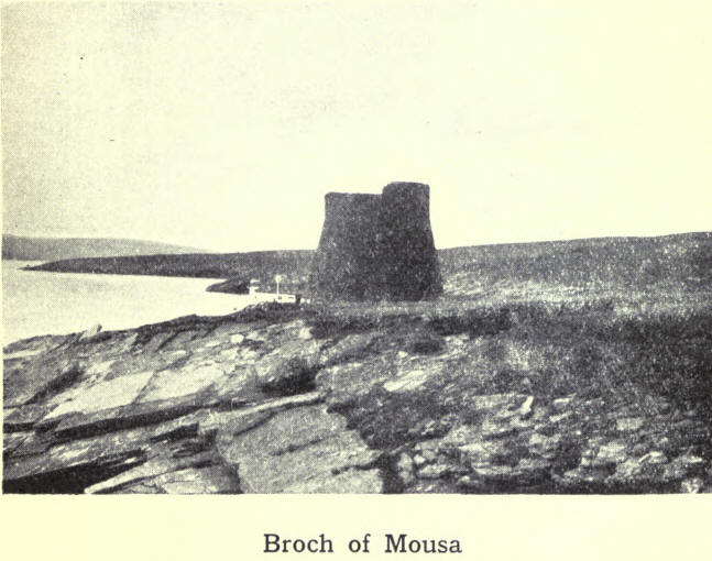 are seventy or eighty. Most of them are in ruins; but the one notable exception is that of Mousa Castle, the most perfect of its kind in existence. Another broch is in the loch of Clickimin. Though only a remnant, it conveys a good idea of the massive structure of these buildings.