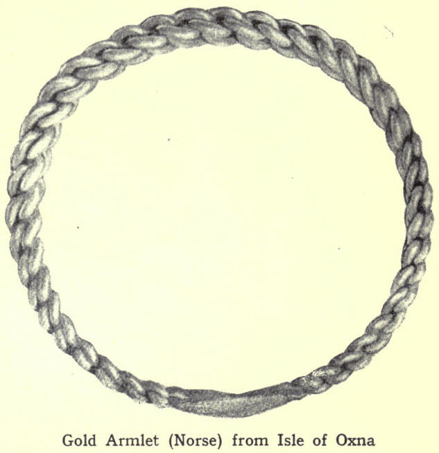 Gold, silver and bronze ornaments of the Viking Age are occasionally discovered—one of the most recent and beautiful a bracelet of gold in the isle of Oxna.